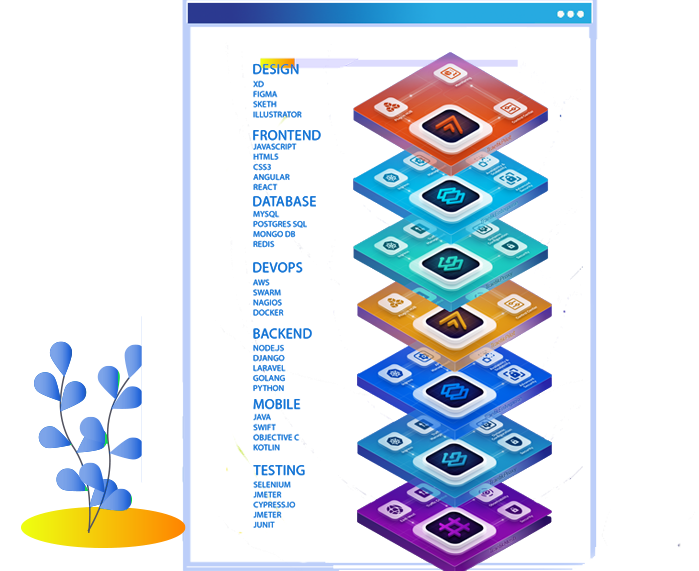 Design : Adobe XD Photoshop Sketch Illustrator Frontend :Js Typescript HTML 5 CSS3 Angular React Database : Mysql PostgreSQL MongoDB Redis Devops: Docker AWS Swarm Nagios Monit Bitbucket Backend : Node.js Django Laravel Golang Python Mobile : Java Swift Objective C Kotlin Testing : Cypres.io Postman Selenium Jmeter Junit